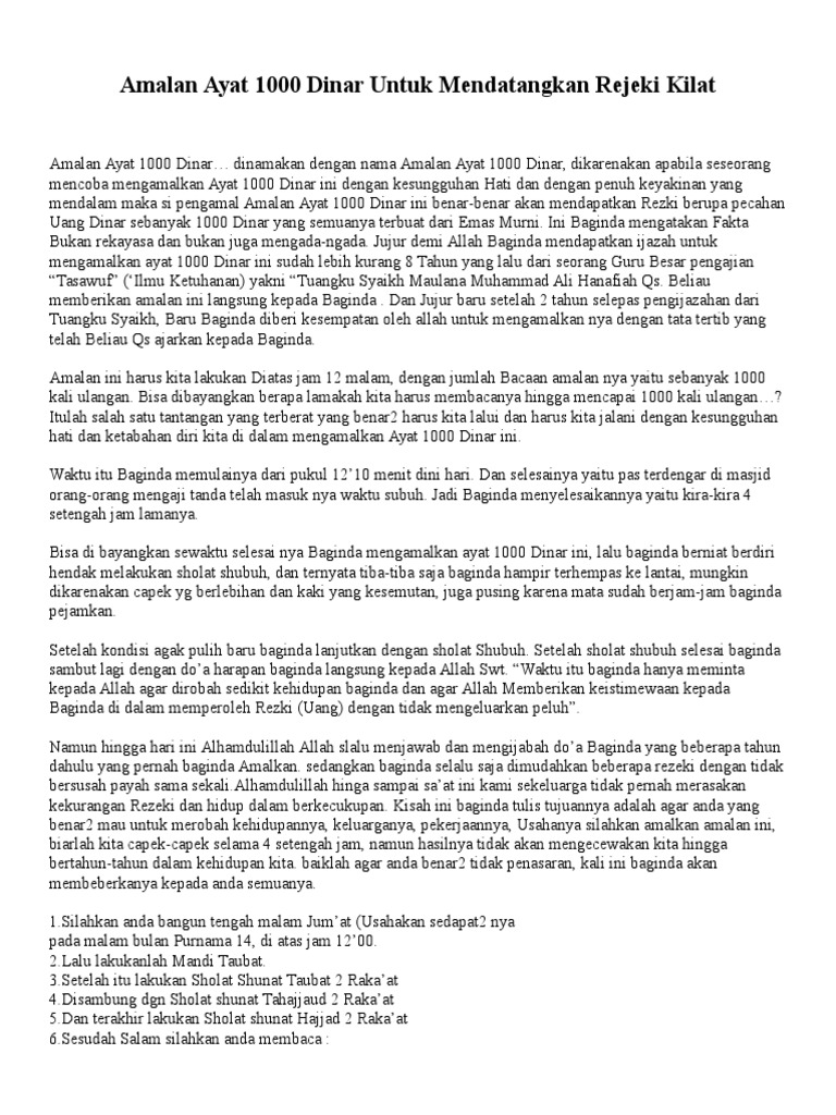Ayat seribu dinar ni apa?? Alias, semuanya hanya mengarang tanpa dasar yang dibenarkan. Apabila anda memahami rahasia amalan seribu dinar, maka anda akan mengalami banyak keajaiban dalam hal rezeki dan kekayaan. Wa man yattaqillaaha yaj'al lahuu makhrojan, wa yarzuqhu min haitsu laa yahtasibu,wa man. Apabila anda memahami rahasia amalan seribu dinar, maka anda akan mengalami banyak keajaiban dalam hal rezeki dan kekayaan.